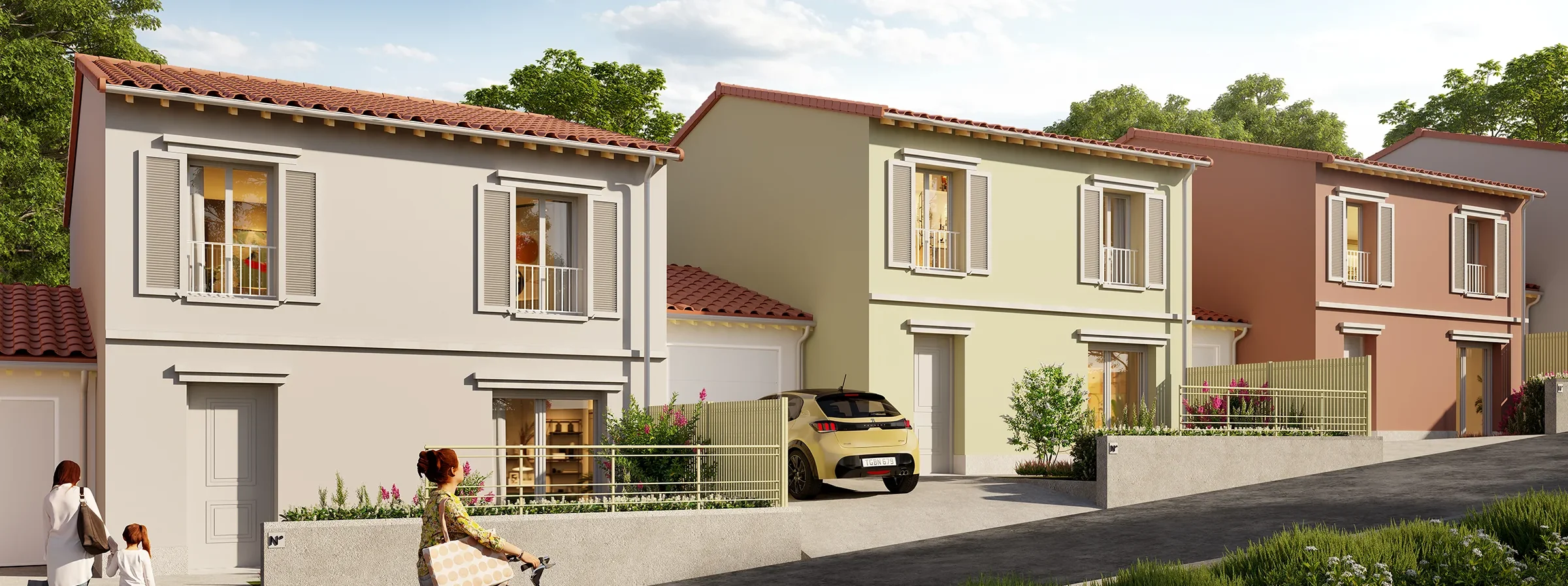 Les 14 maisons de 4 et 5 pièces se déploient avec élégance, légèrement décalées pour préserver l’intimité tout en ouvrant les perspectives sur la verdure.